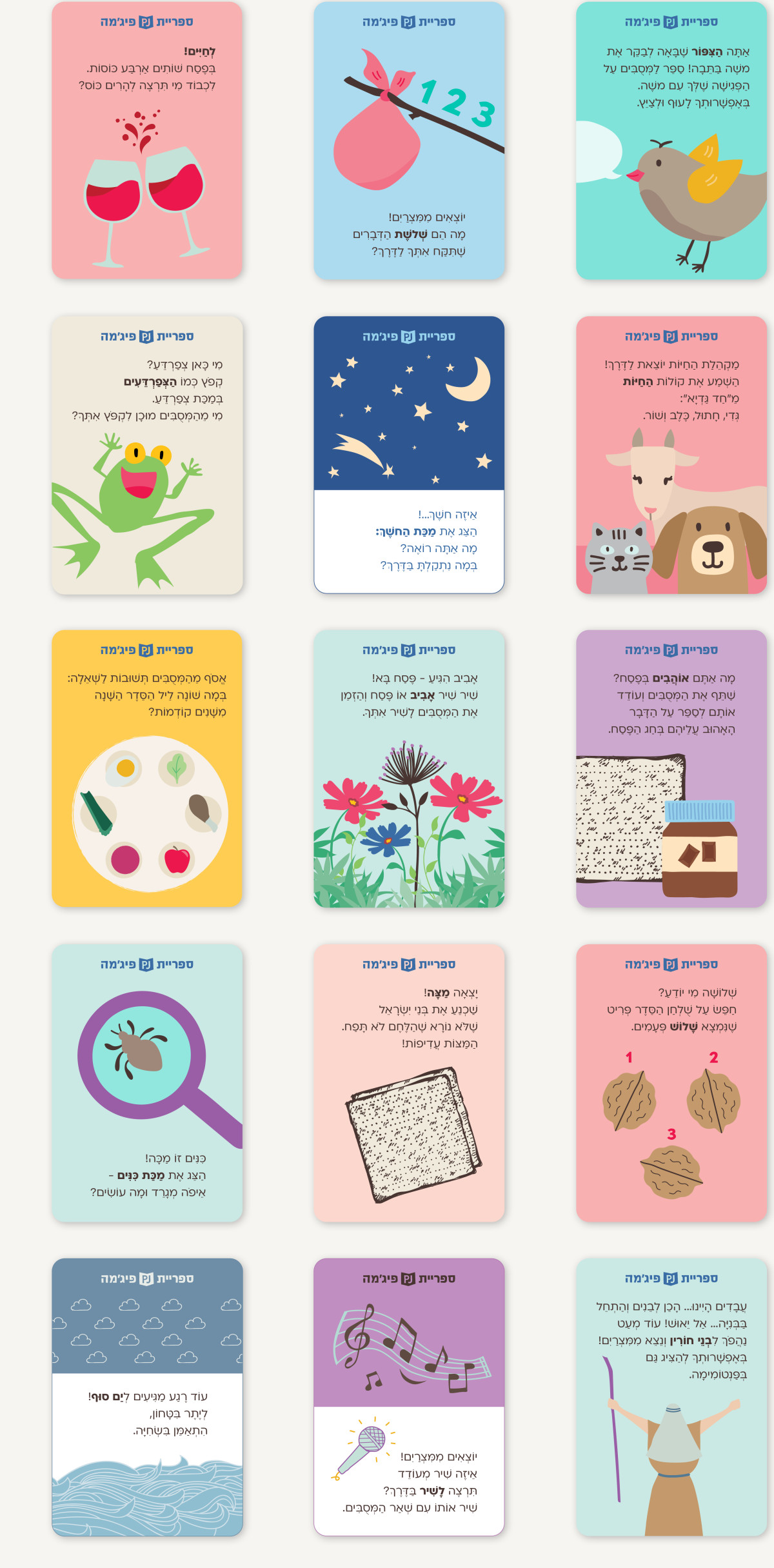 בימי הסגר הראשון של קורונה, כשנודע שכולנו נקיים את ליל הסדר במסגרות מצומצמות, ״ספריית פיג'מה״ פנו אליי עם אתגר מיוחד: לעצב משחק קלפים שיהיה זמין להדפסה ביתית לכל משפחה בישראל ויהפוך את ליל הסדר למהנה ומשמעותי.